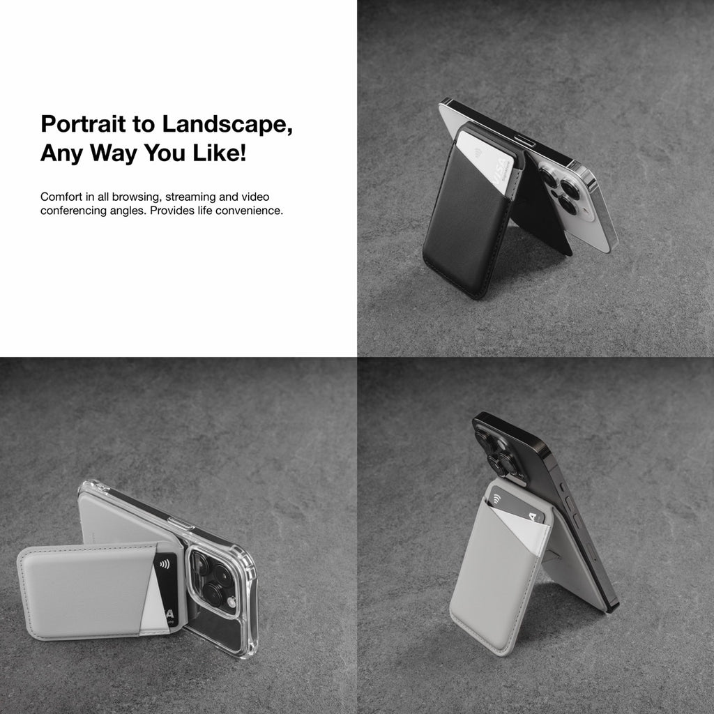 Functions as both a card holder and an adjustable stand for hands-free viewing in portrait or landscape mode.