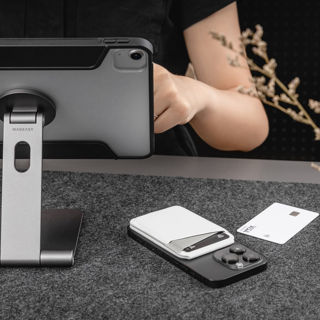 Simplify your everyday carry with the Mageasy Snap Stand Wallet. Designed with built-in magnets, it securely attaches to your iPhone or MagSafe-compatible case, combining a slim card holder and a versatile phone stand in one sleek accessory.