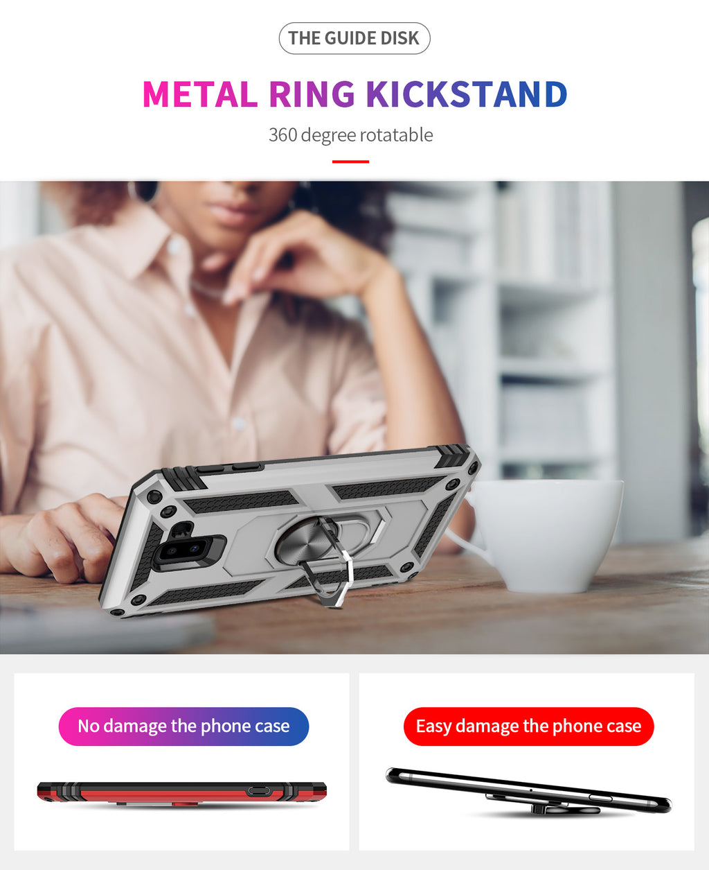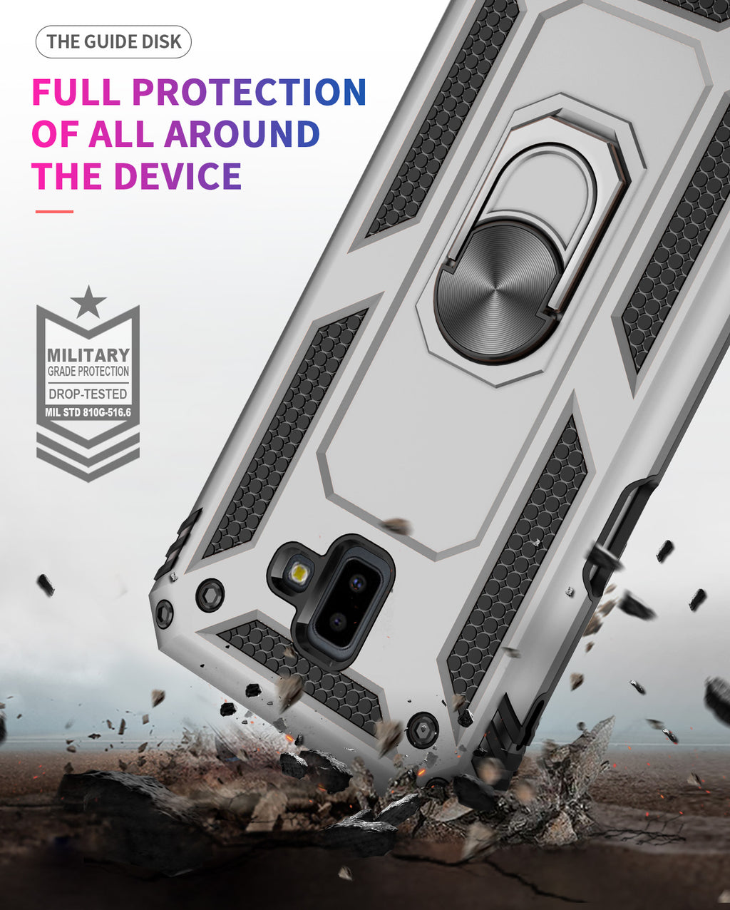 360 degree rotatable aluminum alloy ring kickstand on the Samsung J6 Plus Case allows for the optimal viewing position