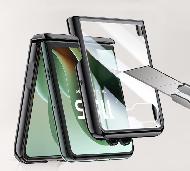 Upgrade your Motorola Razr 50 / Razr 60 with our Icebreaker Series Electroplated Hinge Case, a perfect blend of style and protection. This innovative case is made with a transparent back that lets your phone’s original finish shine through, while the built-in tempered glass screen protector offers full coverage and scratch resistance—no need for a separate screen film!