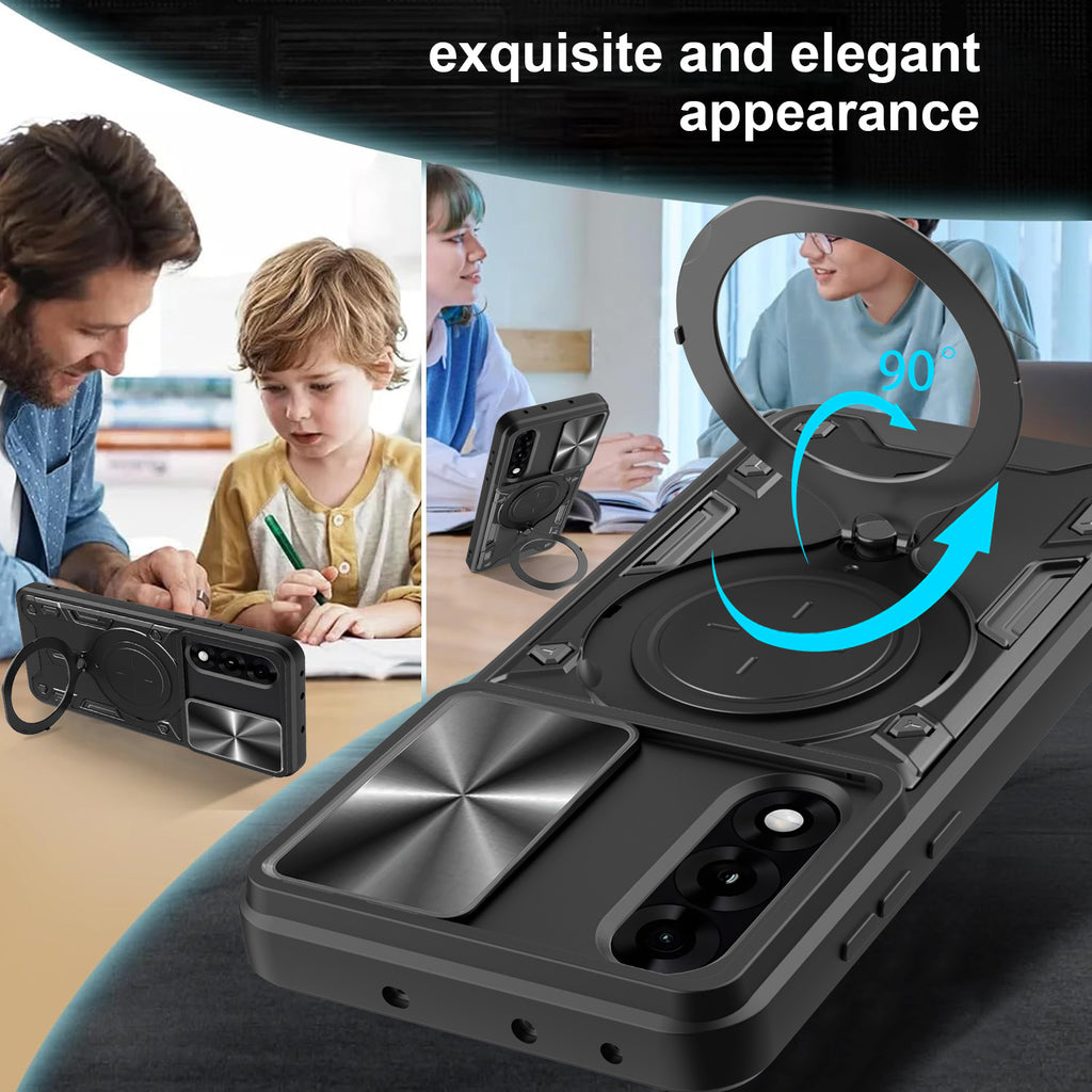 Add bold style and reliable protection to your phone with this Rugged Armor Ring Case, specially designed for the OnePlus Nord 5. Featuring a CD-textured sliding camera cover, built-in metal ring stand, and shock-resistant design, this case is perfect for users who need function and toughness — all in one.