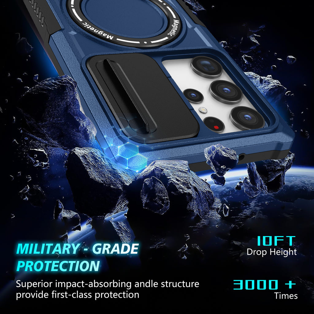 Quality MagSafe Compatible Magnetic Ring Heavy Duty Kickstand Samsung Galaxy S22 Ultra Case with Rear Camera Sliding Cover