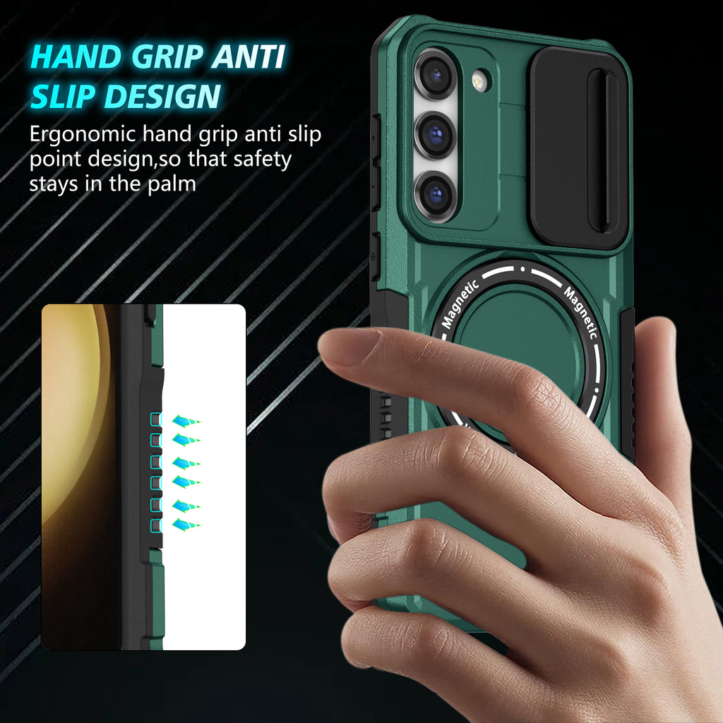 Quality MagSafe Compatible Magnetic Ring Heavy Duty Kickstand Samsung Galaxy S23+ Case with Rear Camera Sliding Cover