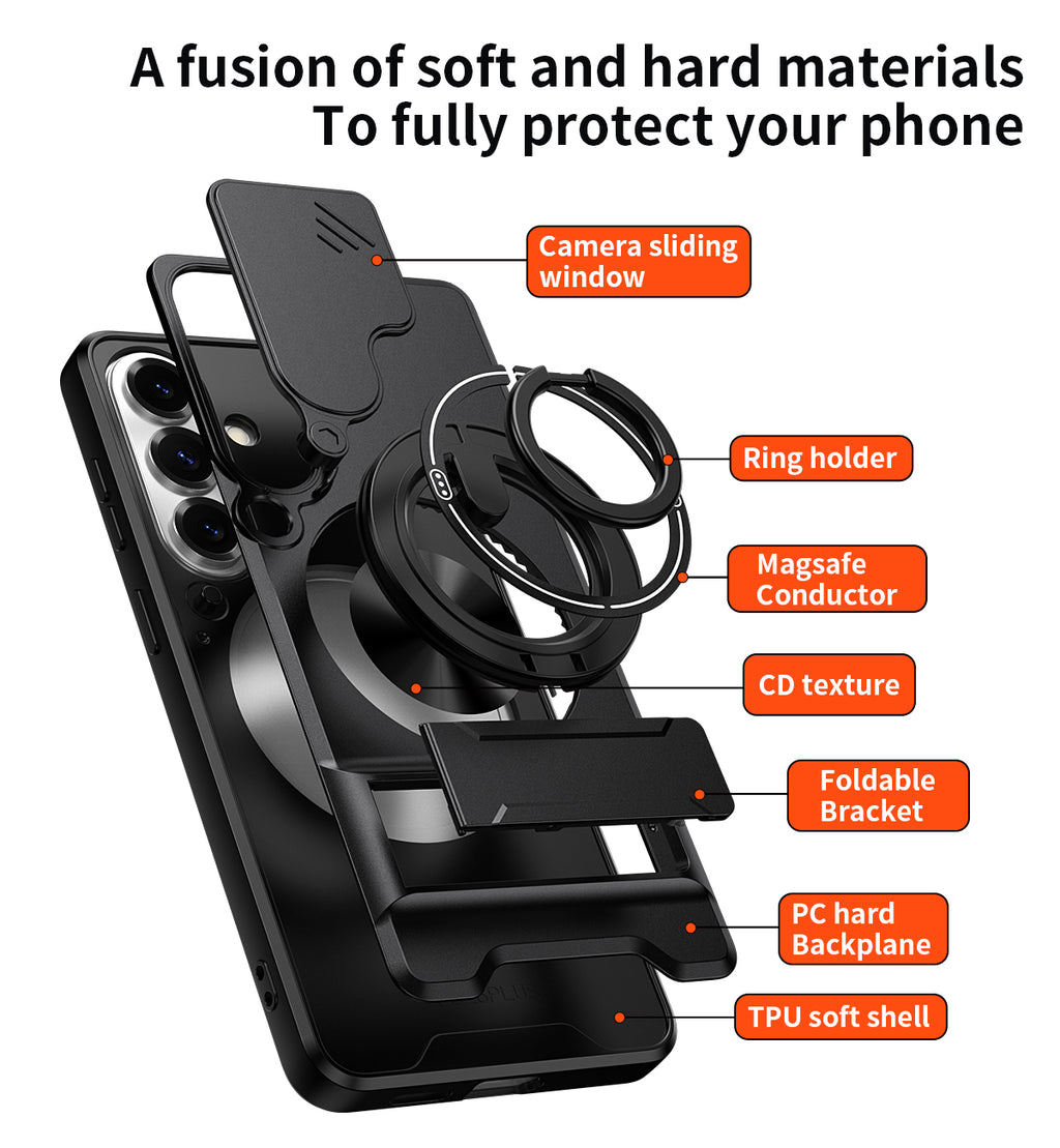 Designed with a MagSafe-compatible magnetic ring, rotating ring holder, and sliding camera cover for everyday protection and convenience.