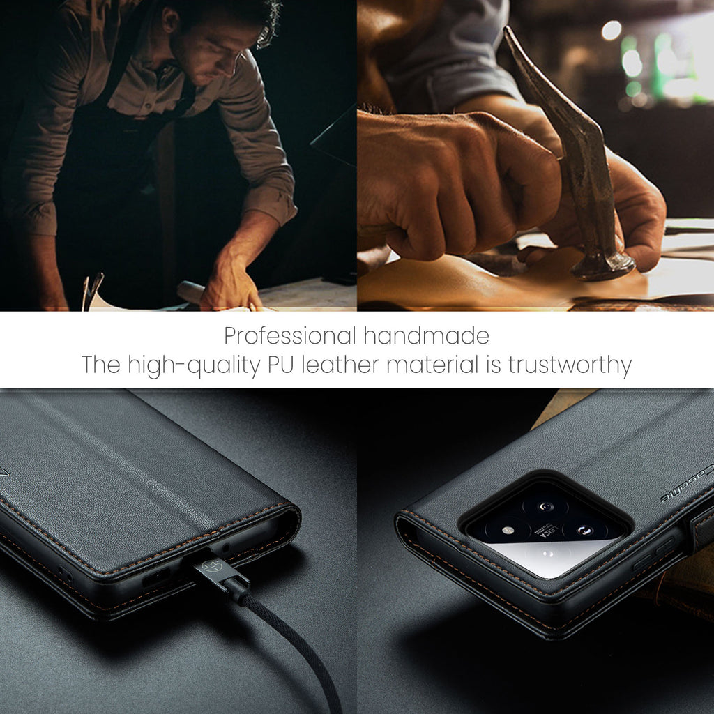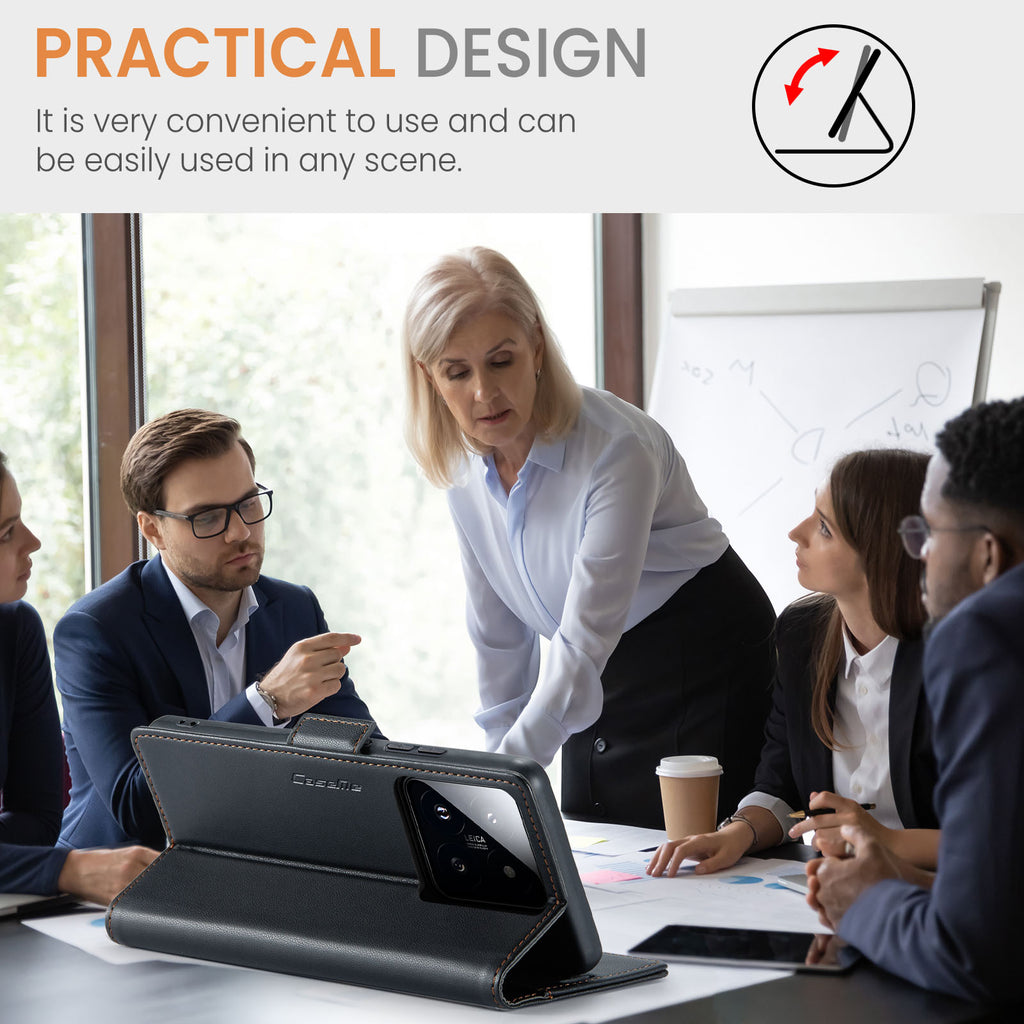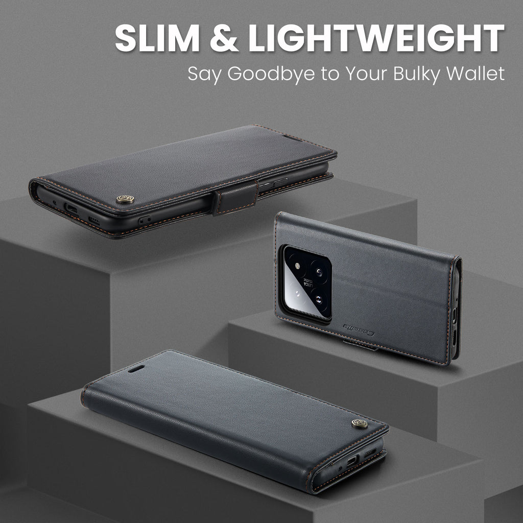 Stylish wallet designed for Xiaomi 14. Crafted with stylish PU leather material, this Xiaomi 14 Case adds a deluxe look to your device.