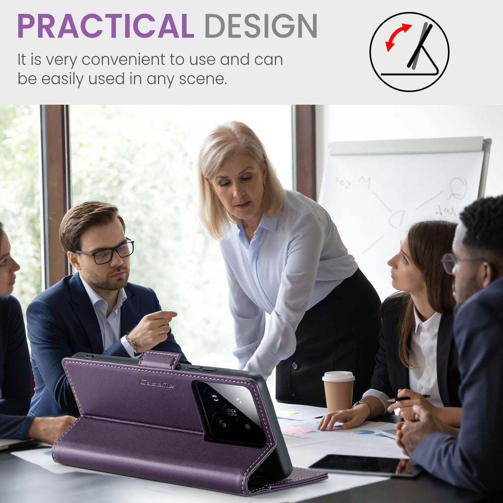 Stylish wallet designed for Xiaomi 14. Crafted with stylish PU leather material, this Xiaomi 14 Case adds a deluxe look to your device.