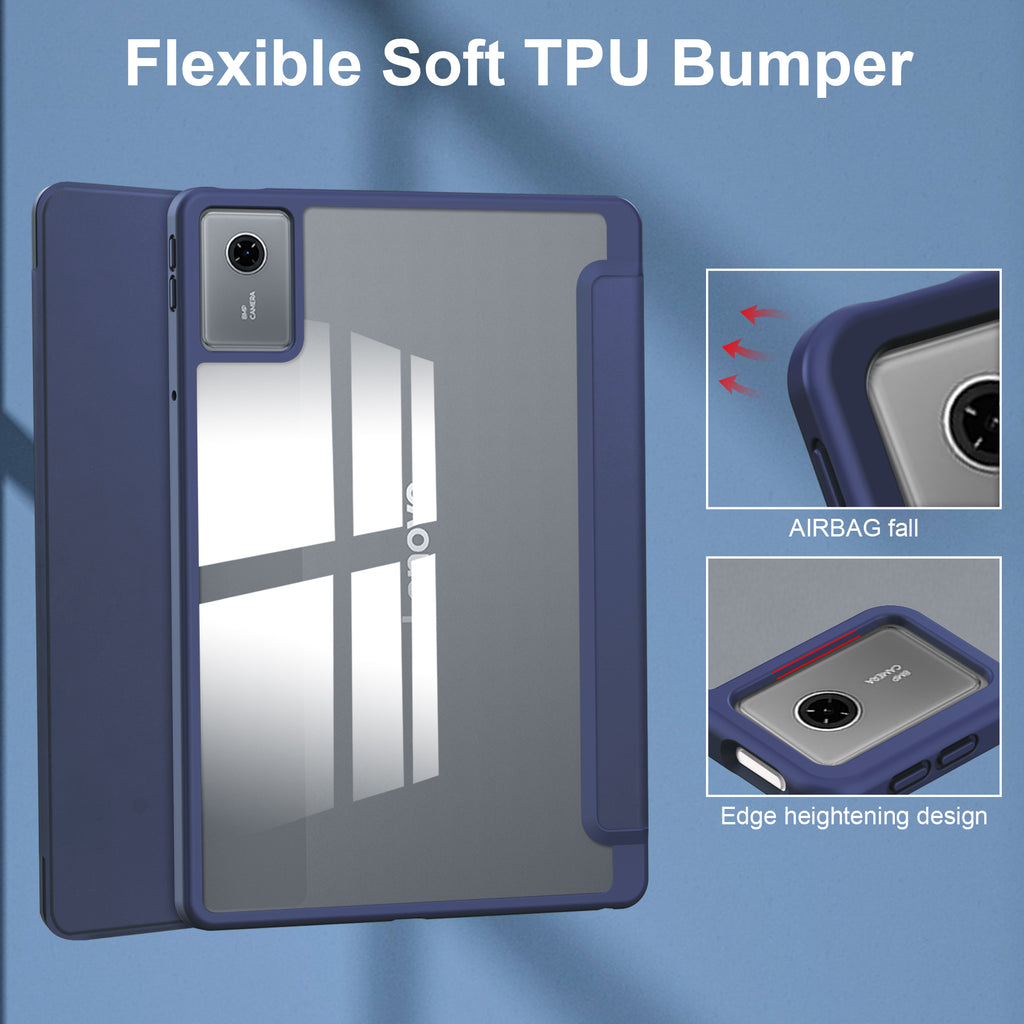 Protect your Lenovo Idea Tab 11 with the new Smart Acrylic Tri-Fold Case — a premium design that combines a clear Acrylic back panel with a flexible TPU bumper and magnetic PU leather cover. It features a built-in stylus holder and foldable stand for viewing and typing modes.